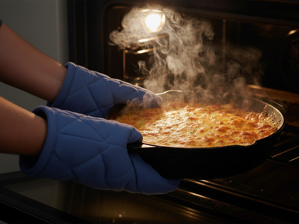 Remove the skillet from the oven and sprinkle the top with minced chives for a fresh and colorful touch.