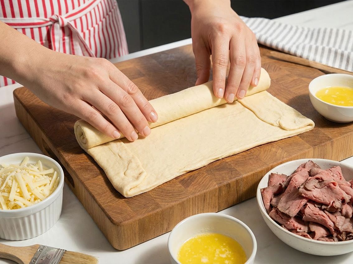 2 tubes crescent dough, 8 ounces Swiss cheese (grated), 1/2 pound roast beef (shaved)